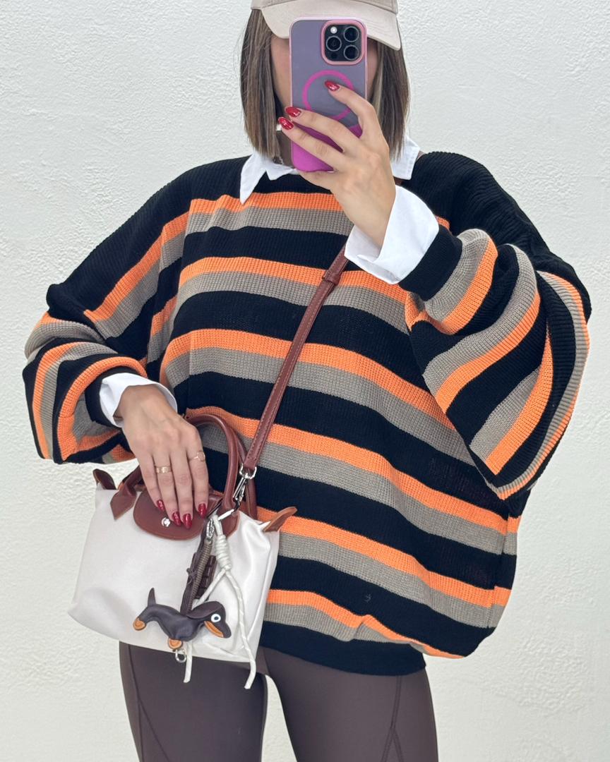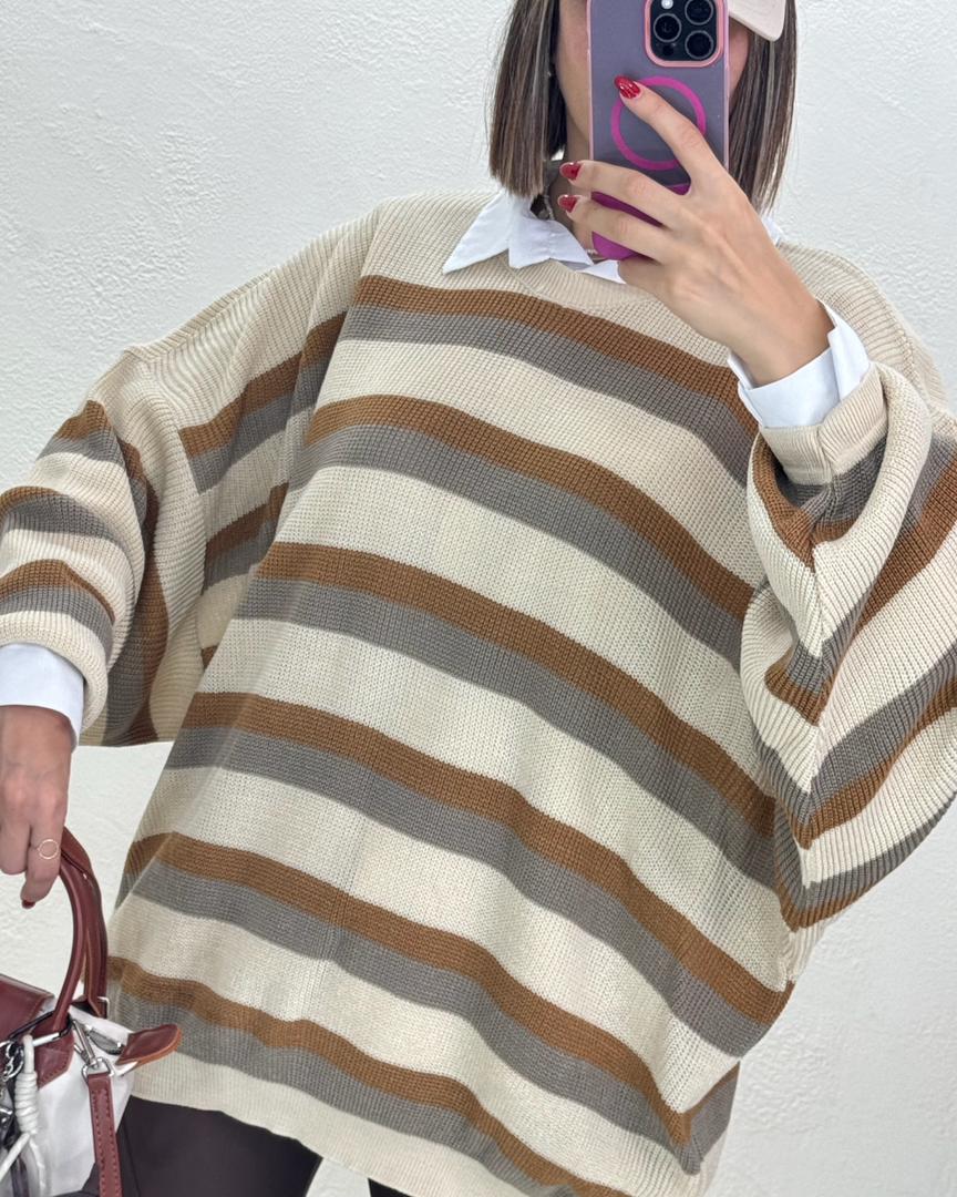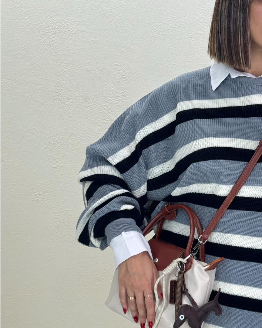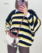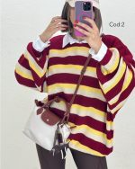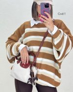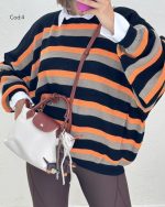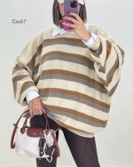 بافت راه راه دینا با کد 8590 یکی از ترندترین بافت های پاییز امسال است این کار با قد78 و دورسینه166 یک بافت اورسایز است که خاص ترین ویژگی این بافت است. یکی از بهترین استایل هایی که با بافت اورسایز میتوانید داشته باشید یک شومیز سفید است(شومیز سفید مربوط به کد 6170 است) و یک لگ که اورسایز بودن بافت را جبران کند و یک استایل خاص به شما بدهد. با خرید بافت دینا بهترین تجربه خرید خود را داشته باشید.